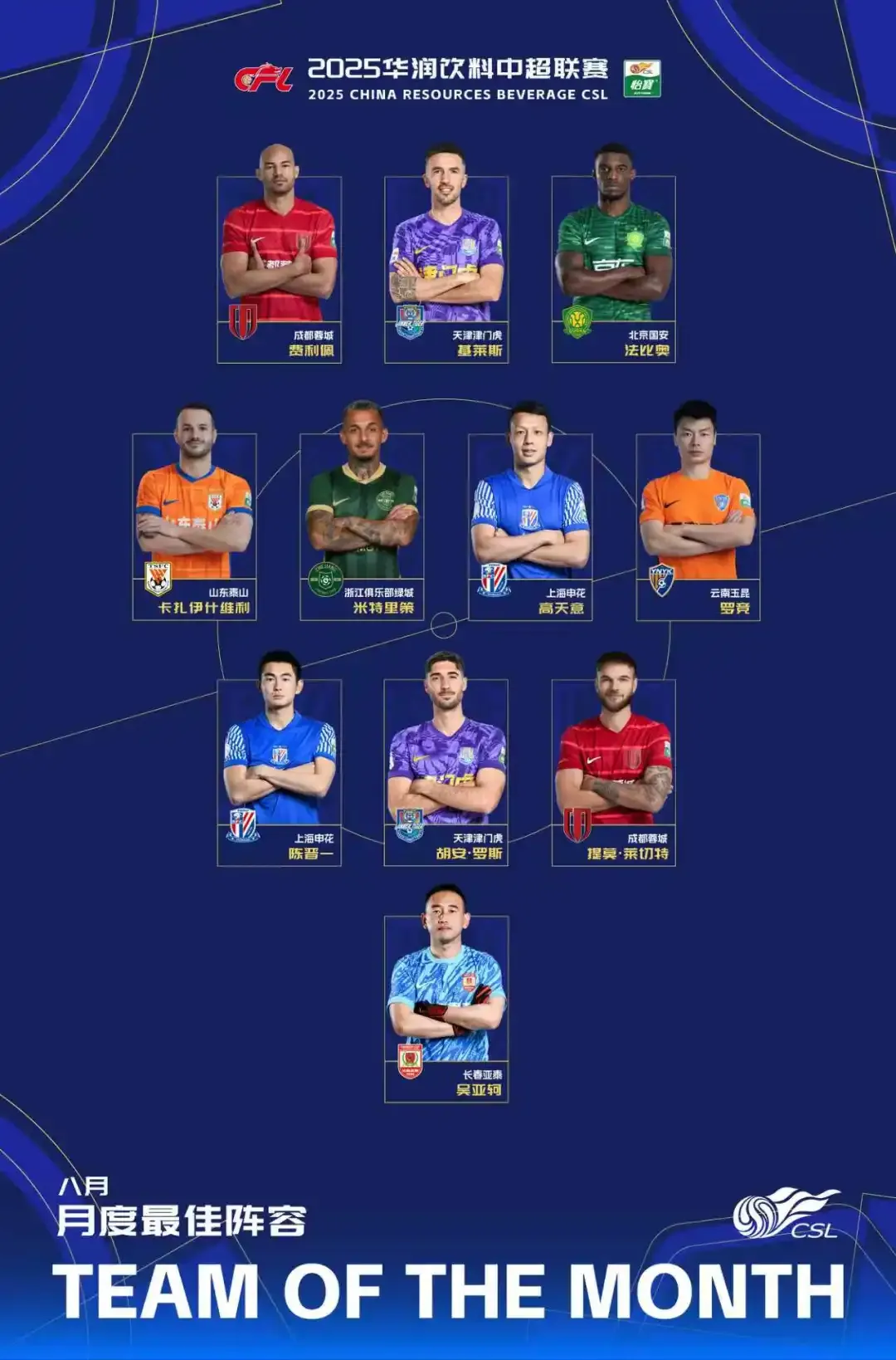 中超官方8月最佳阵容:瓦科领衔,费利佩、法比奥在列